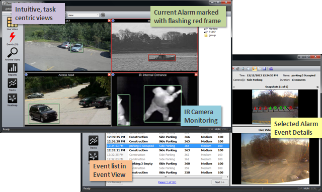 Intuitive task centric views let you easily accomplish tasks, such as event review, searching for events, reviewing archived video, generating reports, searching and reviewing tracks, and generating heatmaps. While different tasks will be used more for different types of deployments, the functionality is included to allow you to get the most from your processed video.